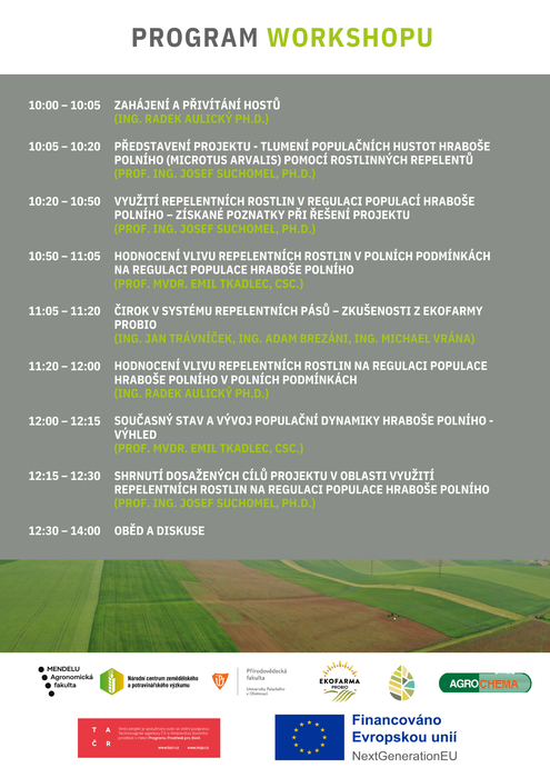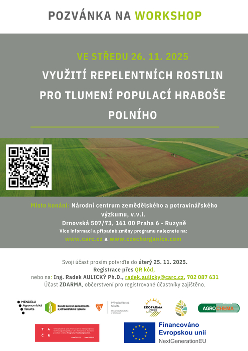 Rádi bychom vás pozvali na workshop věnovaný využití repelentních rostlin pro tlumení populace hraboše polního, který proběhne 26. listopadu 2025 tentokrát v Národním centru zemědělského a potravinářského výzkumu, v.v.i., se sdílem v Praze Ruzyni, v čase od 10 do 15 hodin.